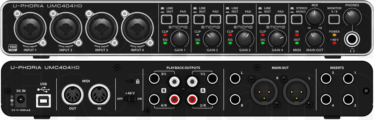 Everything you want in a four-input, tabletop audio interface is in the Behringer U-PHORIA UMC404HD Audio. Behringer has taken full advantage of their relationship with MIDAS in the design of their new digital mixing consoles by offering Midas microphone preamps in some of their other products. So, here you go, two scrumptious Midas mic pres in an affordable 4 x 4 audio interface. In the words of every infomercial spokesperson, but wait, there’s more!