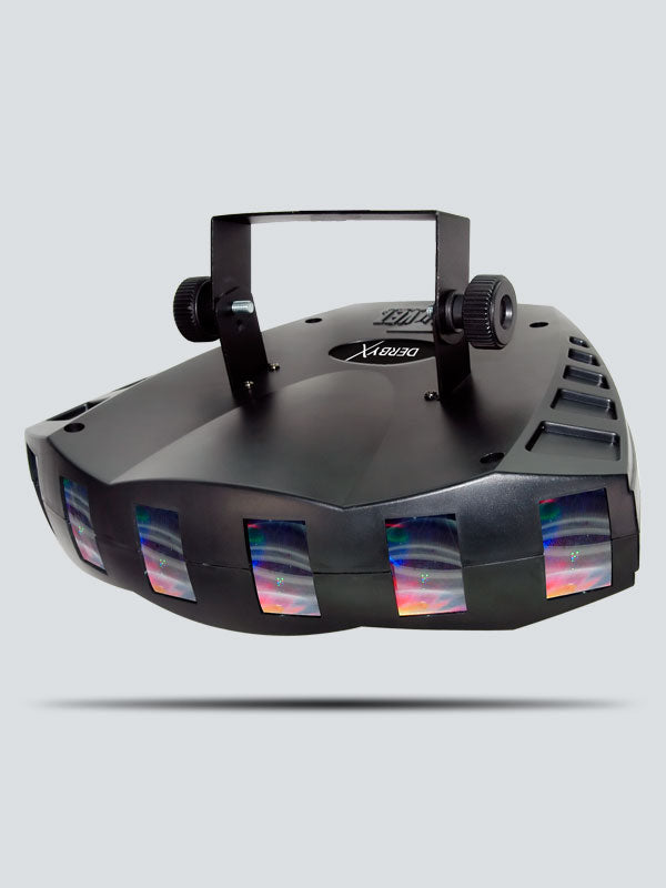 The Derby X is a DMX-512 LED derby effect light, featuring individual control of all 6 LED clusters. Additional features include blackout/static/strobe, built-in automated and sound activated programs, and linkable power for up to 27 units.