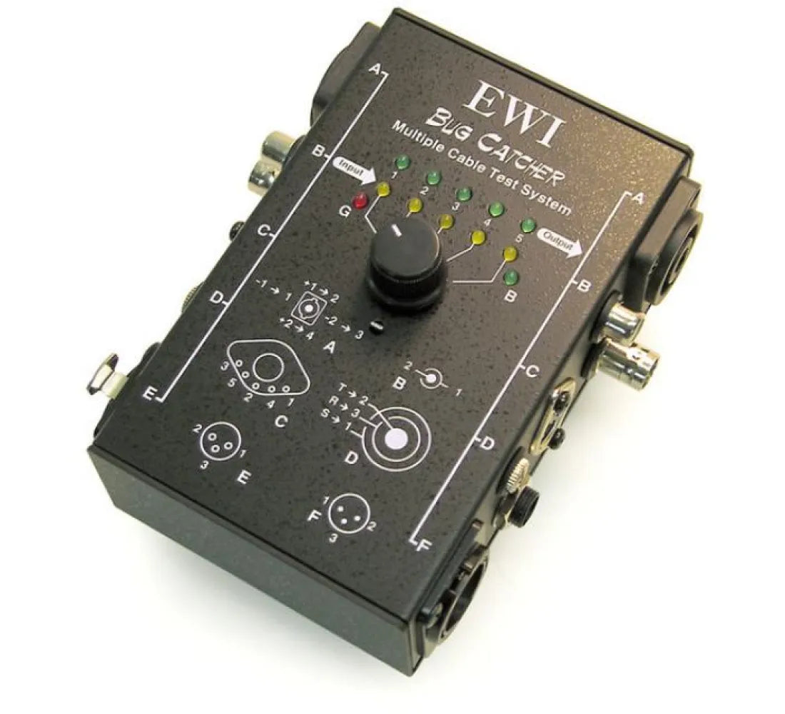 ewic-bug catcher Cable Tester for testing of: XLR 1/4"(6.5mm)Stereo & Mono Jack; 1/8"(3.5mm)Stereo & Mono Jack. RCA; Speakon Connector.BNC.5-pin DIN Jack.